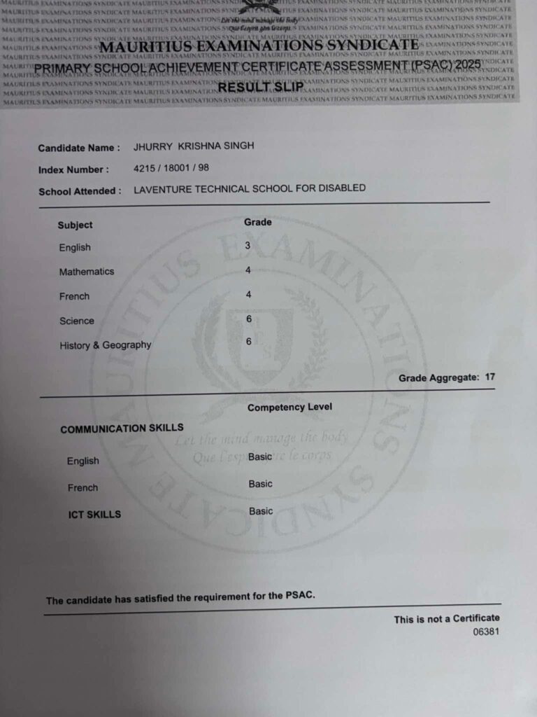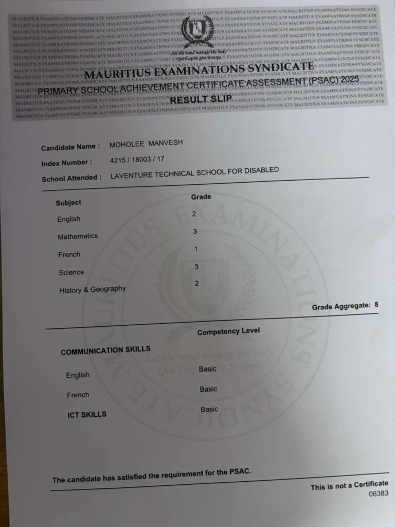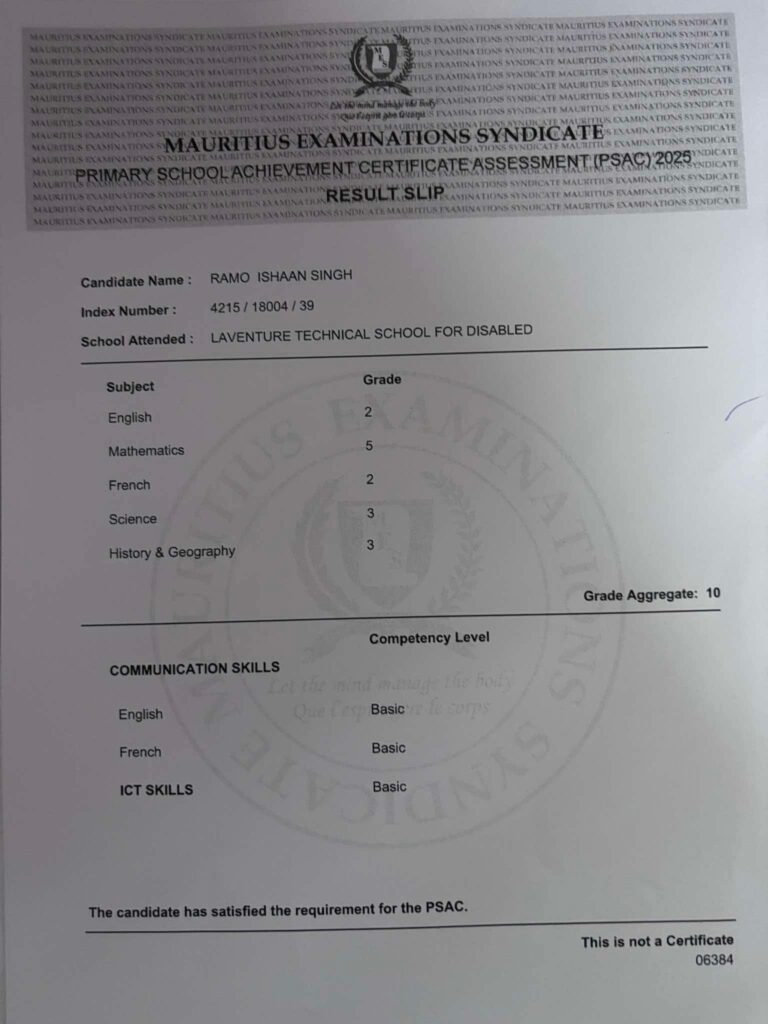 Congratulations to these three students from Laventure Technical School for Disabled — Jhurry Krishna Singh, Moholee Manvesh, and Ramo Ishan Singh. Despite their disabilities, they have shown exemplary determination and worked tirelessly to succeed in the PSAC exams. Their achievement is a true source of inspiration and pride for the entire school community.