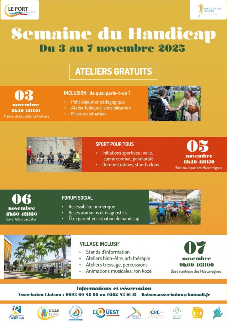 La ville du Port organise, du 3 au 7 novembre 2025, une Semaine nationale du handicap dédiée à l’inclusion et à la solidarité, avec des animations gratuites et accessibles à tous. Les habitants sont invités à participer à divers forums, ateliers, activités sportives et rencontres pour mieux comprendre le handicap et favoriser une société inclusive. La semaine commence avec des ateliers sur le thème de l’inclusion à la Maison de la Solidarité Portoise. Parmi les événements clés, des initiations à la voile et des animations sportives se tiennent à la base nautique des Mascareignes, un forum social aborde des questions d’accessibilité numérique et de santé, et un village inclusif propose des ateliers bien-être, de l’art-thérapie et des animations musicales. Cette initiative, portée par le CCAS du Port et l’Association Liaison, avec l’appui de partenaires locaux, reflète l’engagement collectif du Port en faveur de l’inclusion.